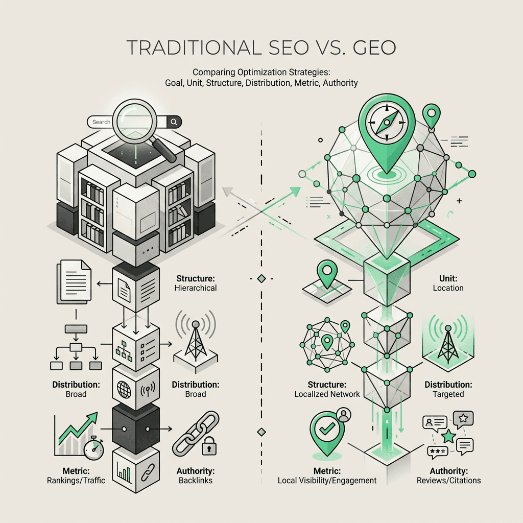 This distinction changes everything about content structure, distribution strategy, and measurement—without invalidating the fundamentals you've already built through traditional search engine optimization.