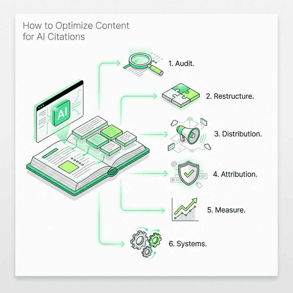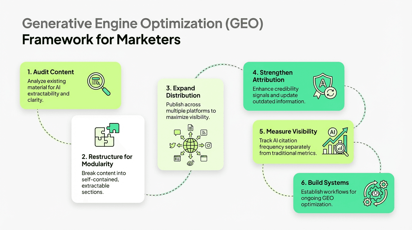Execution over theory: Audit for extractability, restructure for modularity, expand distribution, strengthen attribution signals, measure AI visibility separately, build repeatable systems using proven methodology.