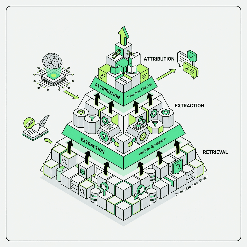 Three-layer model: Retrieval (can AI find your content?), Extraction (can AI parse it?), Attribution (does AI trust it enough to reference it?). Most visibility breakdowns happen during the extraction process.