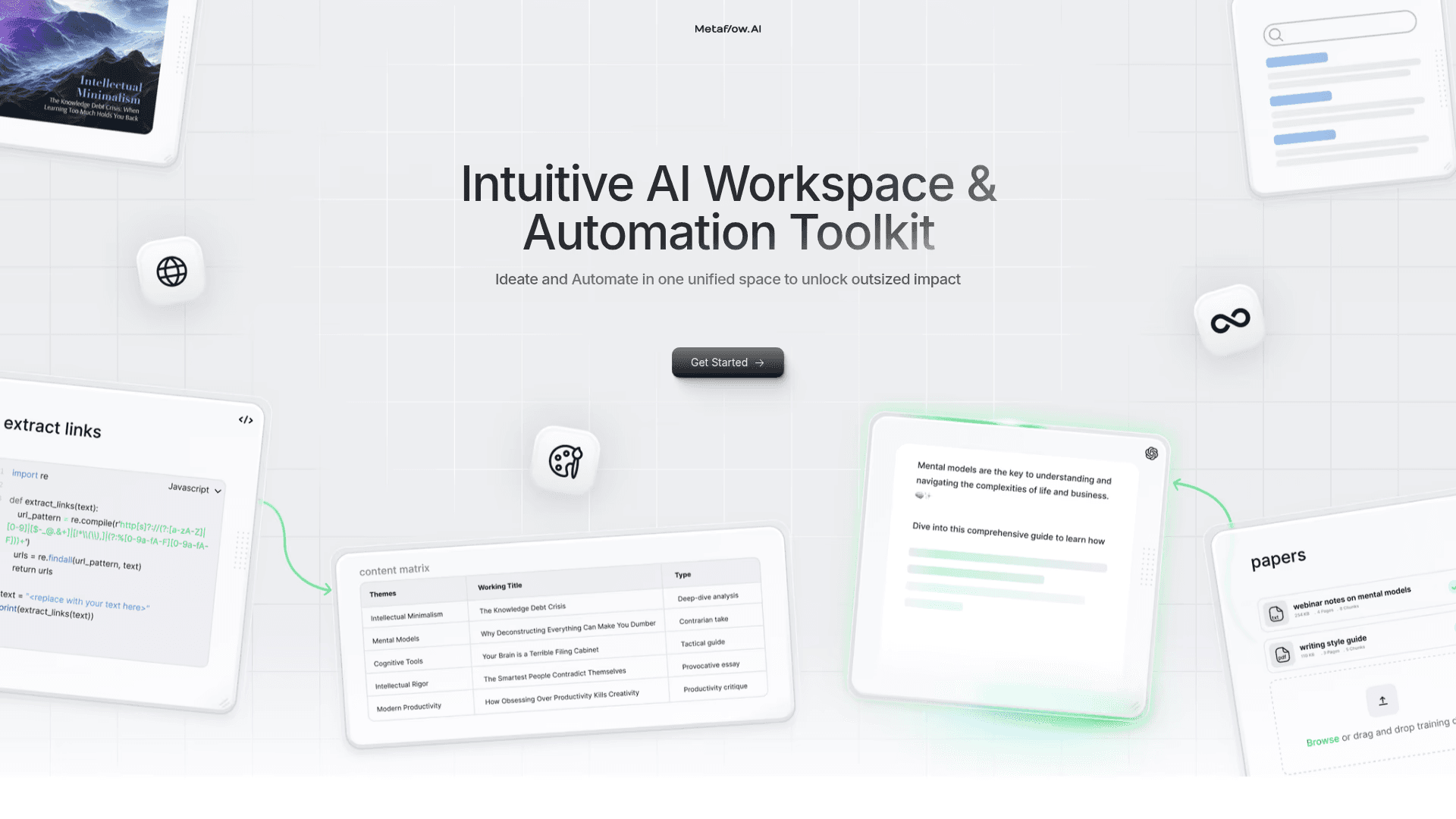 Metaflow.life is a visual AI workflow builder designed to empower growth operators and knowledge workers to create, automate and scale AI-driven workflows without the need for extensive programming knowledge. As an intuitive AI workspace and automation toolkit, Metaflow lets you ideate freely and transform your discoveries into scalable AI workflows. By offering an intuitive, no-code interface, Metaflow.life enables users to construct complex AI workflows by assembling functional blocks, akin to snapping together Lego pieces. Unlike most automation tools that separate creativity from execution, Metaflow provides a unified space where discovery and execution happen together, giving ideas room to be explored, nurtured, and mature into durable systems that unlock outsized impact.
